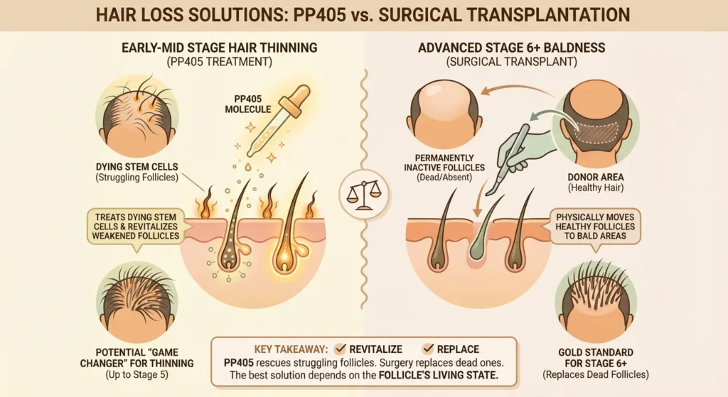 PP405 may be the game changer for those who have hair thinning problems, but for stage 6+ baldness, where the hair follicles are dead, the surgical hair transplantation method is the gold standard, because PP405 can treat the dying stem cells, but cannot treat the permanently inactive hair follicles.