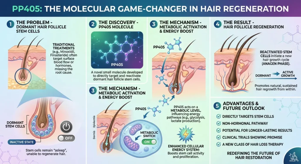 PP405 is a recently discovered molecule that can be a game-changer in the hair regeneration industry. This newly found molecule directly targets the hair follicle stem cells rather than just staying on the scalp surface. The energy system within the hair follicle cells is enhanced, because PP405 acts on a metabolic level.